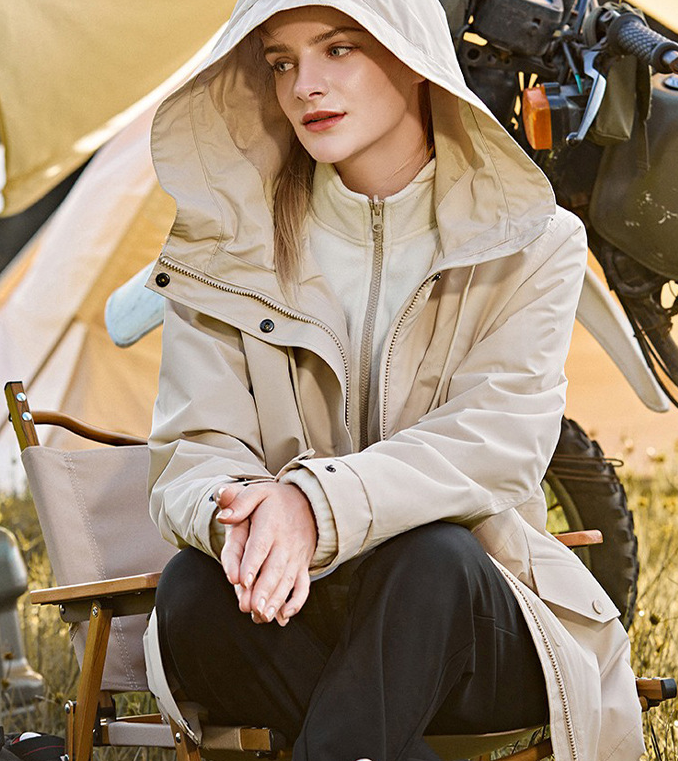 表面防潑水背面貼透氣膜加可特網三合一面料,擁有良好的透氣防水功能,採用100%滌綸絲織造,面料精美,挺括抗磨