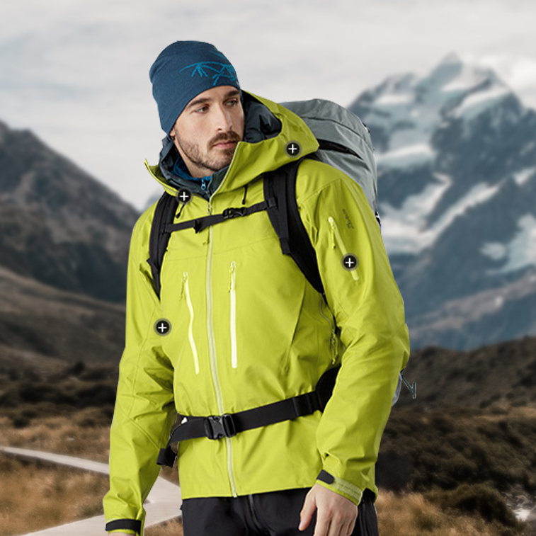 表面防潑水背面貼透氣膜加可特網三合一面料,擁有良好的透氣防水功能,採用100%滌綸絲織造,面料精美,挺括抗磨